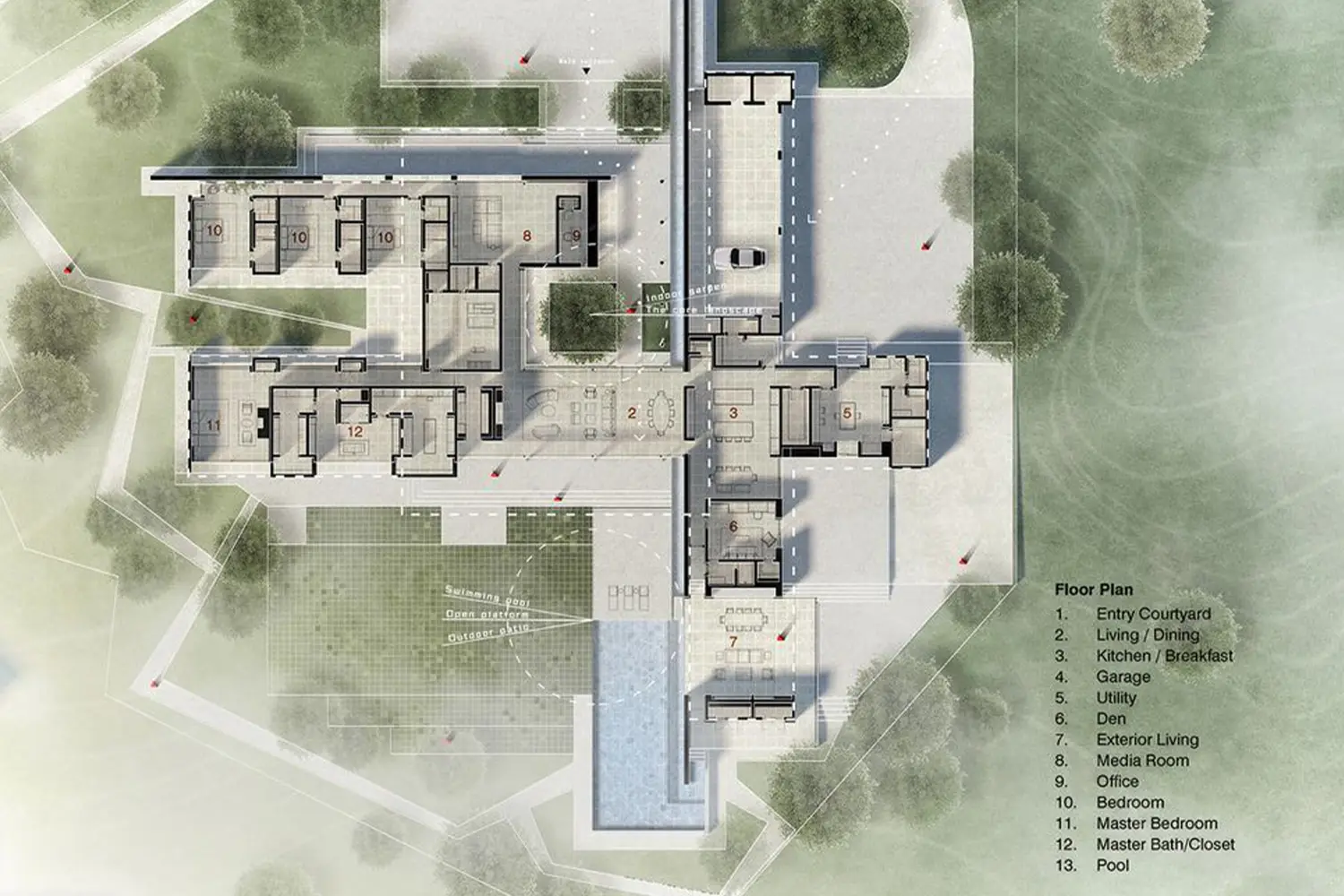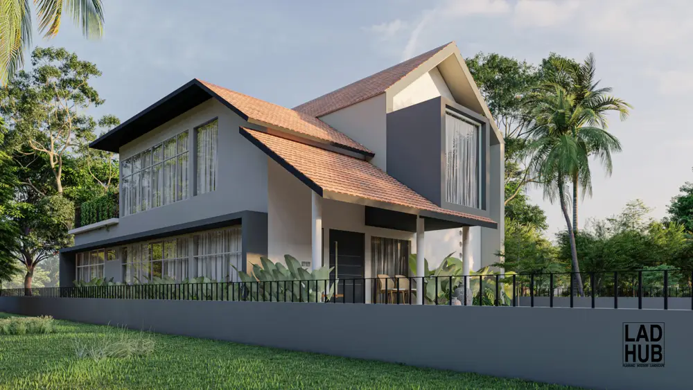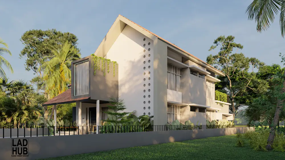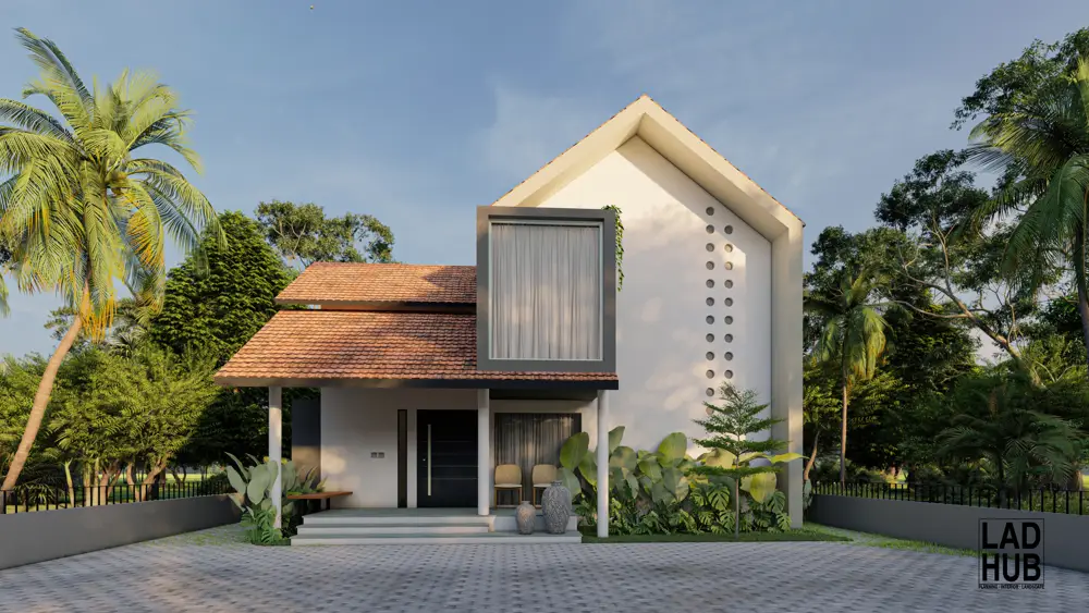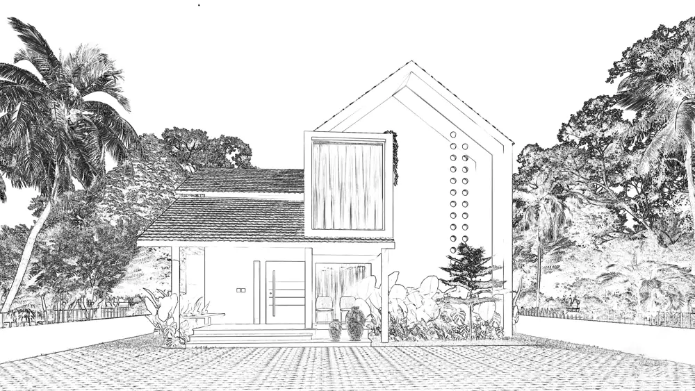 The design concept centers around a striking architectural feature: a single box projecting from the front elevation of the residence. This bold element serves as the focal point of the structure, creating a visual contrast against the surrounding architecture. Its unique placement enhances the overall aesthetic appeal, making it a standout feature of the home’s exterior.