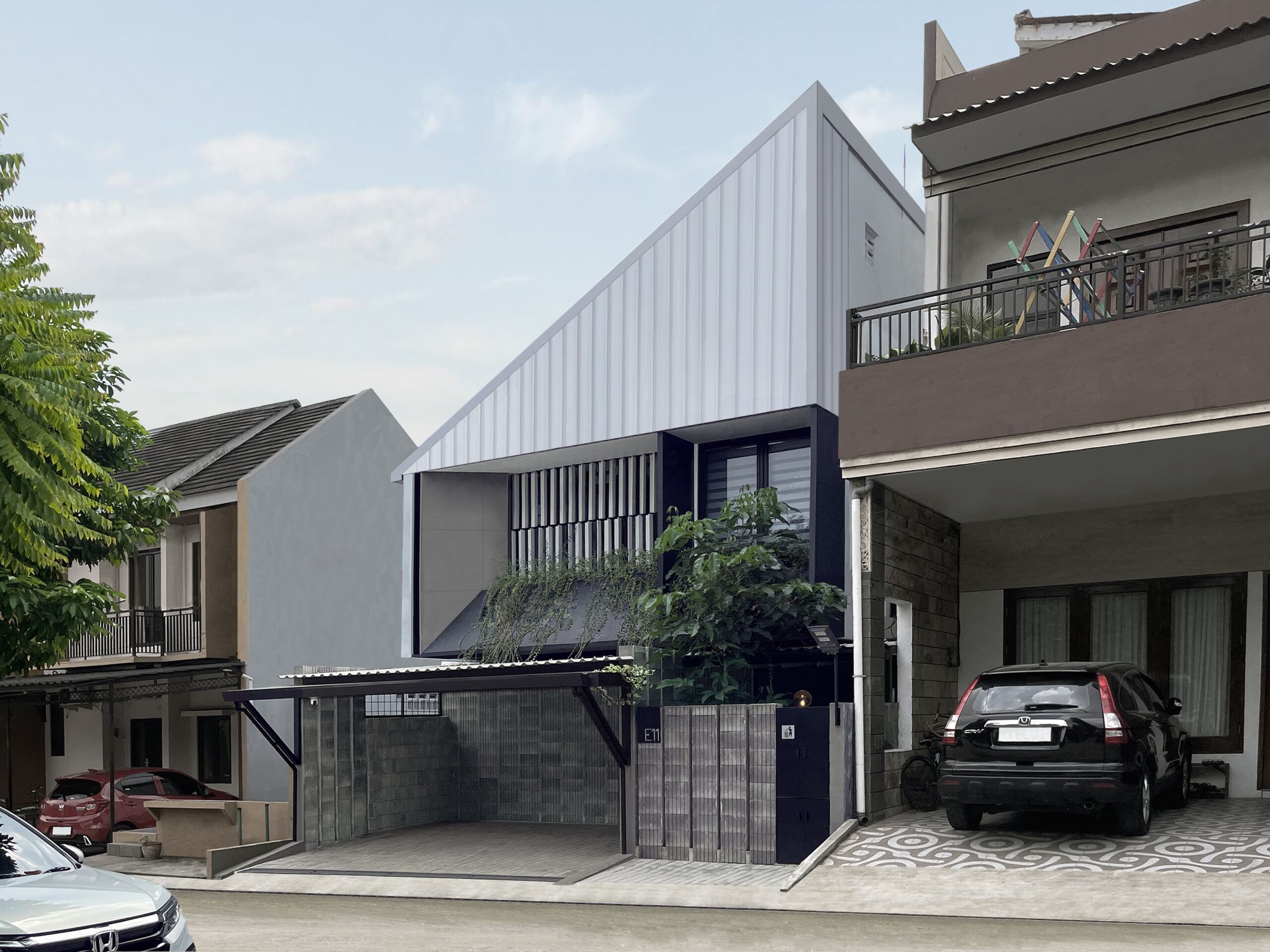 The Niskara House, modern design residential masterpiece situated in a busy neighborhood. It emphasizes privacy and thoughtful materiality while blending seamlessly with its surroundings. Located on a south-facing plot, the house confronts challenges from neighboring buildings. Its design prioritizes privacy through strategic vegetation and material choices, including the removal of an invasive tree. The layout spans two floors, with communal living spaces on the first floor and private bedrooms on the second. Inspired by mid-century design, the Niskara House features strong geometric forms and natural textures. Its exterior is clad in reflective Bluescope steel, minimizing heat absorption and enhancing interior comfort. The design incorporates a bold yet clean aesthetic through a raw material palette complemented by green and white accents. The interior embraces minimalism and functionality, with concrete stairs and industrial fixtures adding character. Open voids promote light and air circulation, while the kitchen connects to a small herb garden, merging indoor and outdoor spaces. Built-in features maximize utility without sacrificing style. Overall, the Niskara House exemplifies modern architecture by prioritizing privacy, sustainability, and innovative design, making it a unique representation of contemporary residential values.